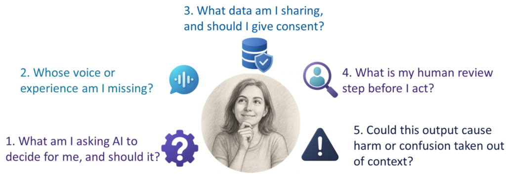 Before sharing AI assisted work, these questions help ensure that the output is appropriate, accurate, and aligned with the expectations of your role:
