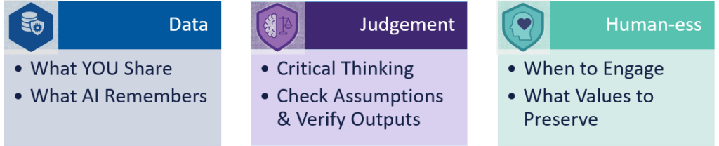 I believe that Responsible AI Use begins with an awareness of what is at stake in day-to-day practice. Three elements require consistent attention because they shape the quality and consequences of our work: what I refer to as data, judgment, and human-ness.